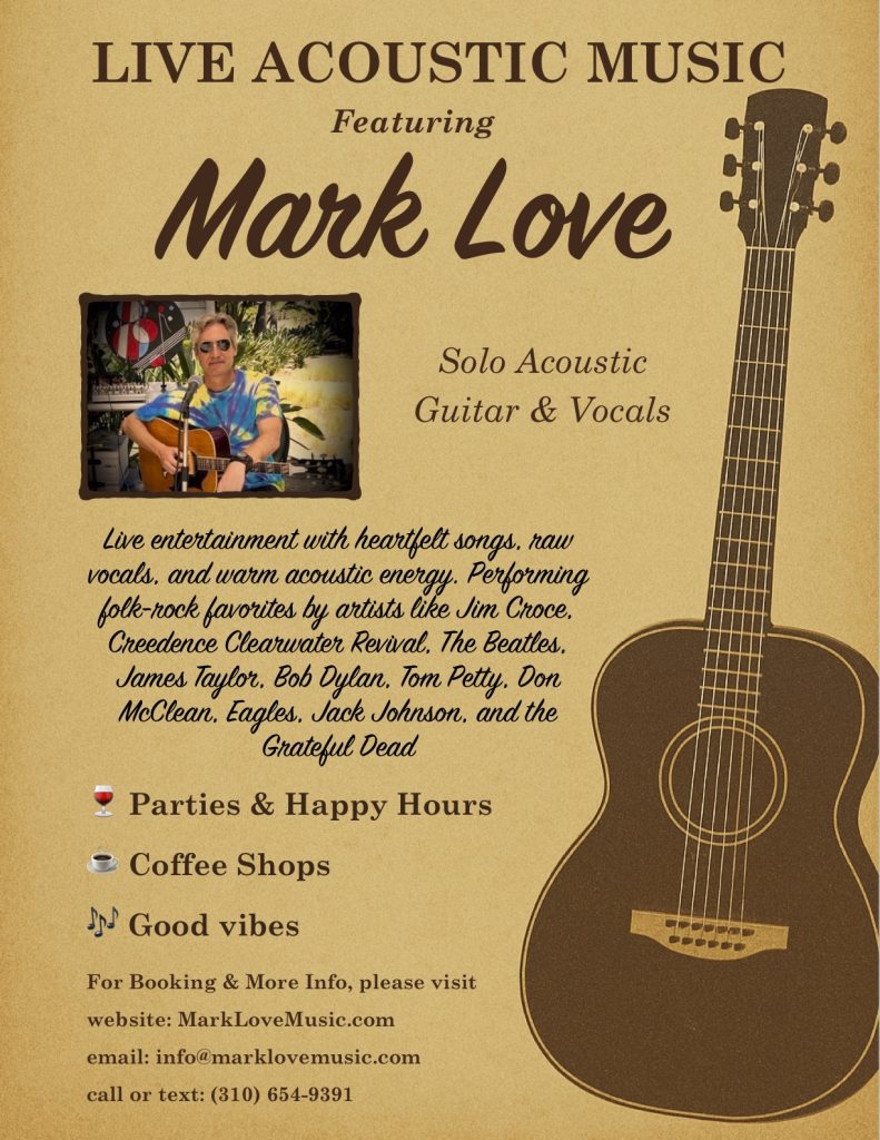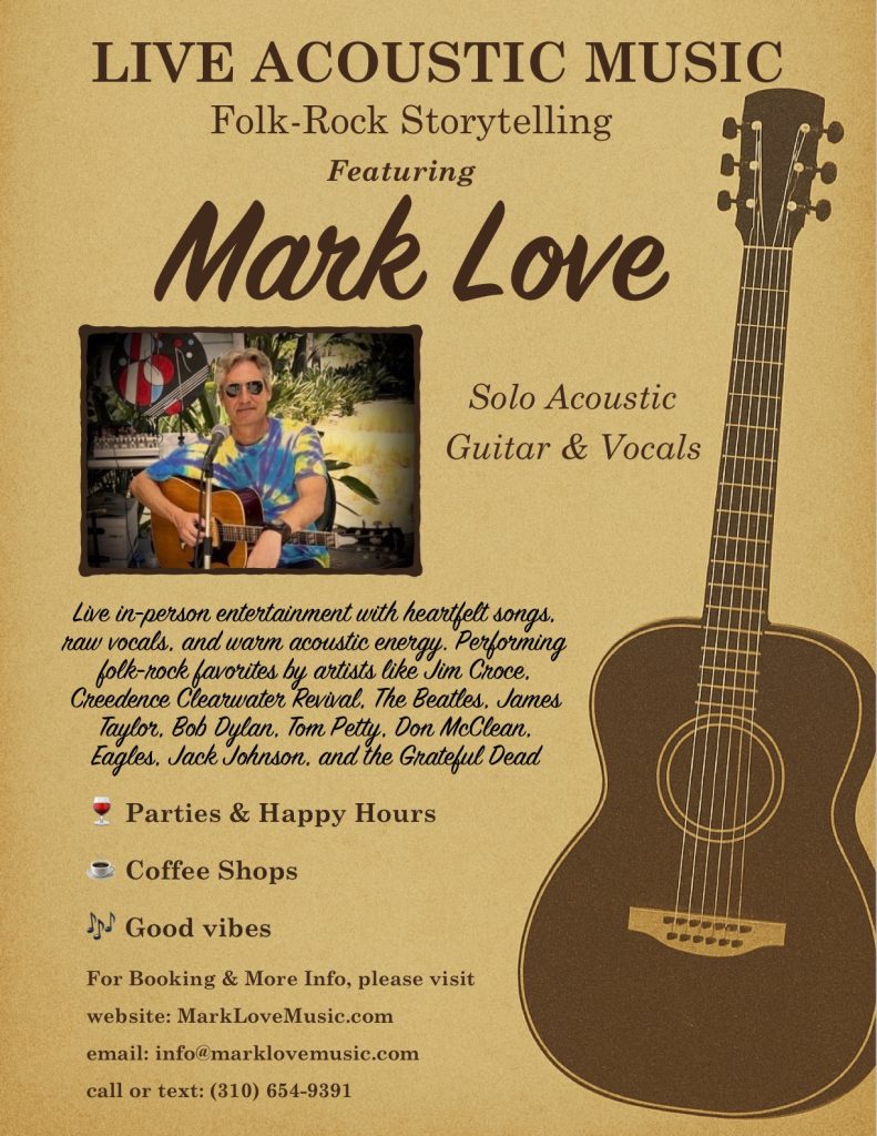 Available for parties, happy hours, coffe shops, and the like. Live entertainment with heartfelt songs, raw vocals, and warm acoustic energy. Performing folk-rock favorites by artists like Jim Croce, Creedence Clearwater Revival, The Beatles, James Taylor, Bob Dylan, Tom Petty, Don McClean, Eagles, Jack Johnson, and the Grateful Dead.